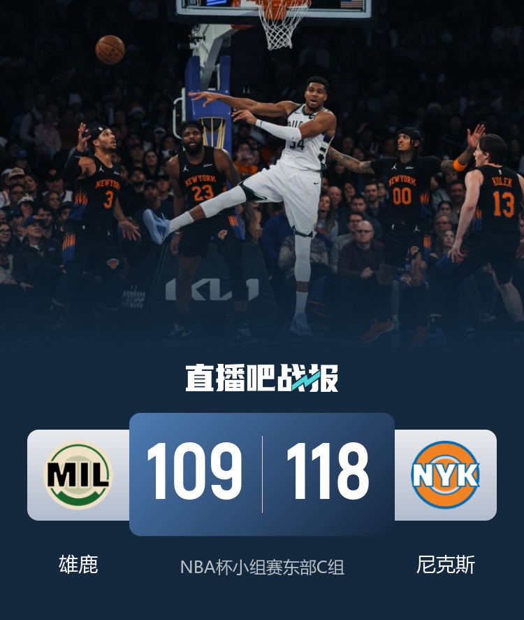 比赛开始,双方开场短暂相持,字母哥打成2+1引领雄鹿11-2的攻击波取得领先,AJ·格林连中三分,但尼克斯多点开花,不断冲击内线得手,哈特连续打成2+1率队反超,此后尼克斯再度哑火,雄鹿再轰11-0的攻击波确立优势,尼克斯及时回暖连中三分,半场战罢雄鹿62-61击败尼克斯。易边再战,布伦森火力全开,单打独得16分帮助球队占据场上主动,雄鹿轮番冲击内线拿分,AJ·格林三分还有,末节库兹马连续拿分带队追赶,关键时刻布伦森连投带罚拿到6分稳住局势,雄鹿大势已去无力回天。最终,雄鹿109-118不敌尼克斯,杯赛出局。