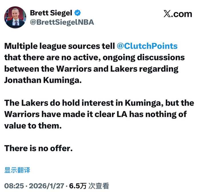 “多位联盟消息人士透露 ,勇士和湖人之间没有就库明加进行任何积极的、正在进行的讨论。湖人确实对库明加感兴趣,但勇士已经明确表示,湖人拿不出有价值的筹码,也没有任何正式报价。”