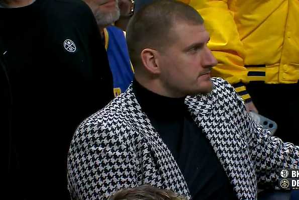 比赛第二节,转播镜头给到替补席身穿便装的约基奇。