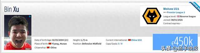 1月29日,据五星体育消息:德国转会市场(Transfermarkt)更新信息,U23国足队长、青岛西海岸中场徐彬已经成为狼队U21球员。